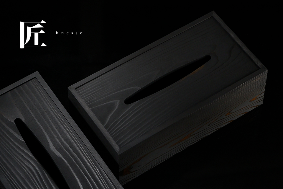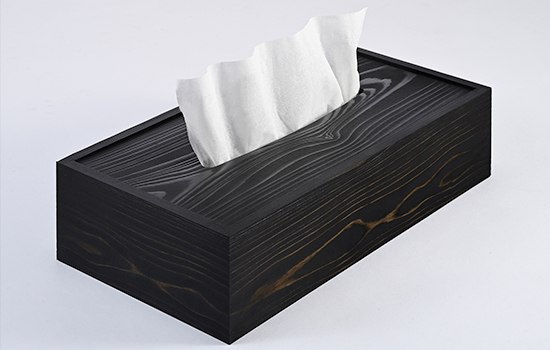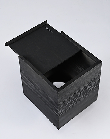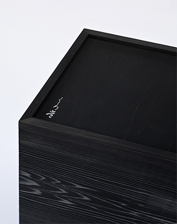 一枚の杉板から次々に切り取った四枚の杉板で箱の側面を作ることにより、側面の木目が 繋がったままでぐるりと一周しています。また拭き漆仕上げとなっており、外側だけでなく、 内側も拭き漆を施すことで、杉材の強度を上げております。