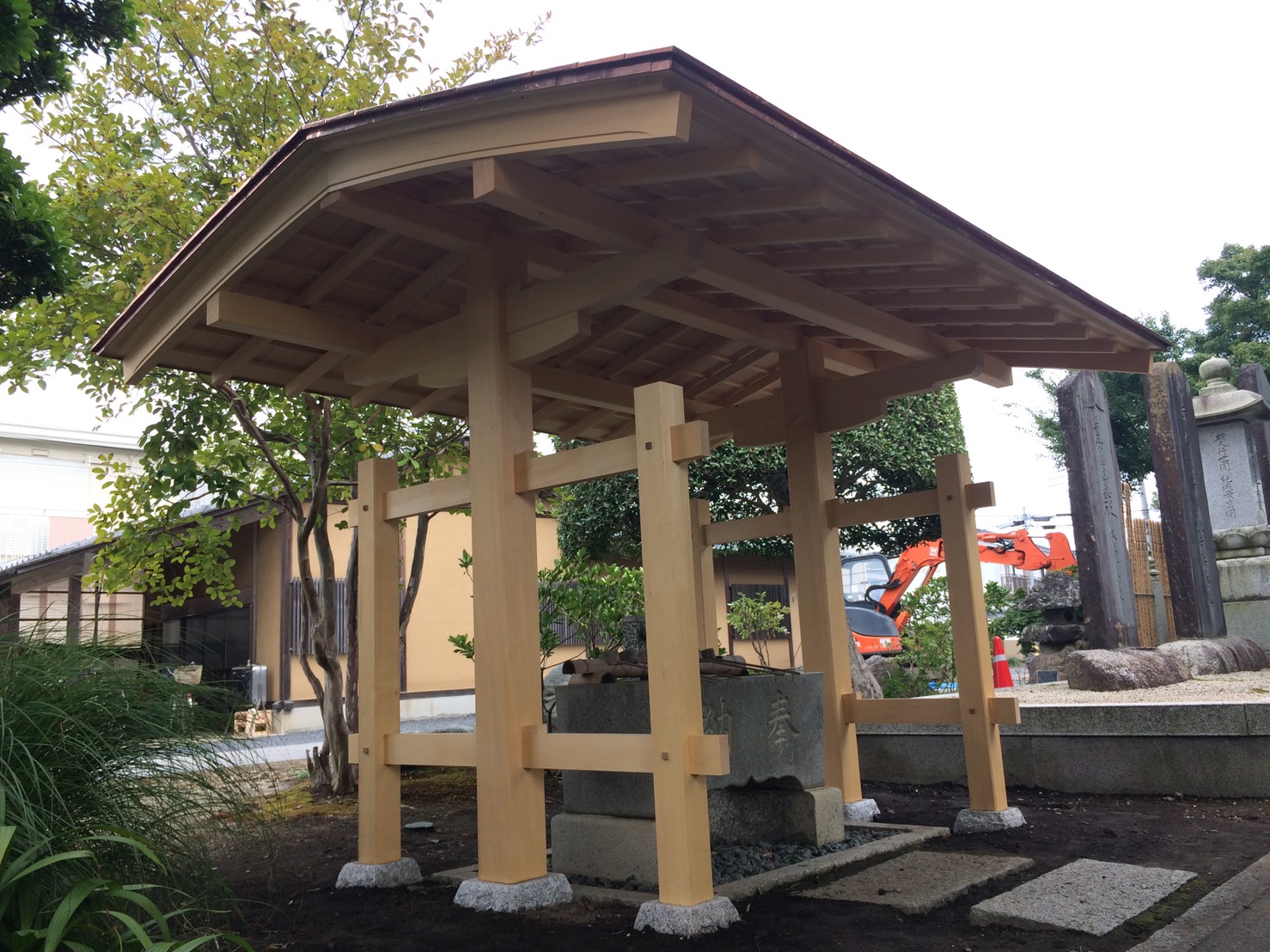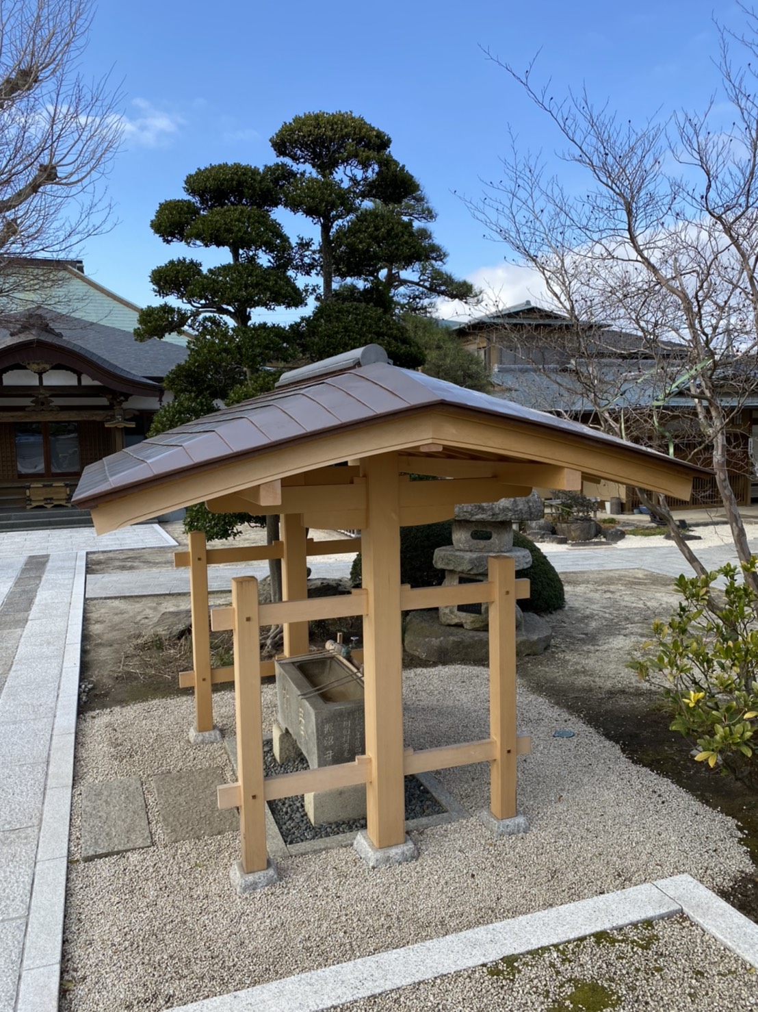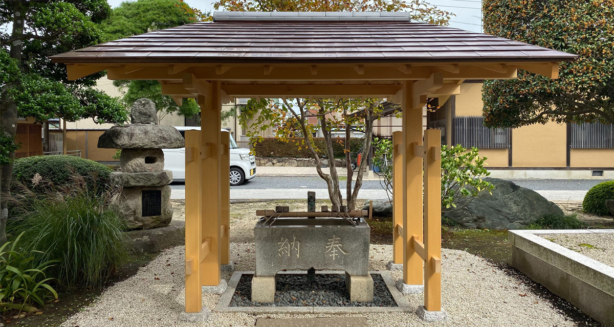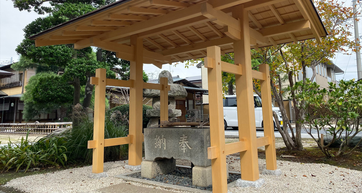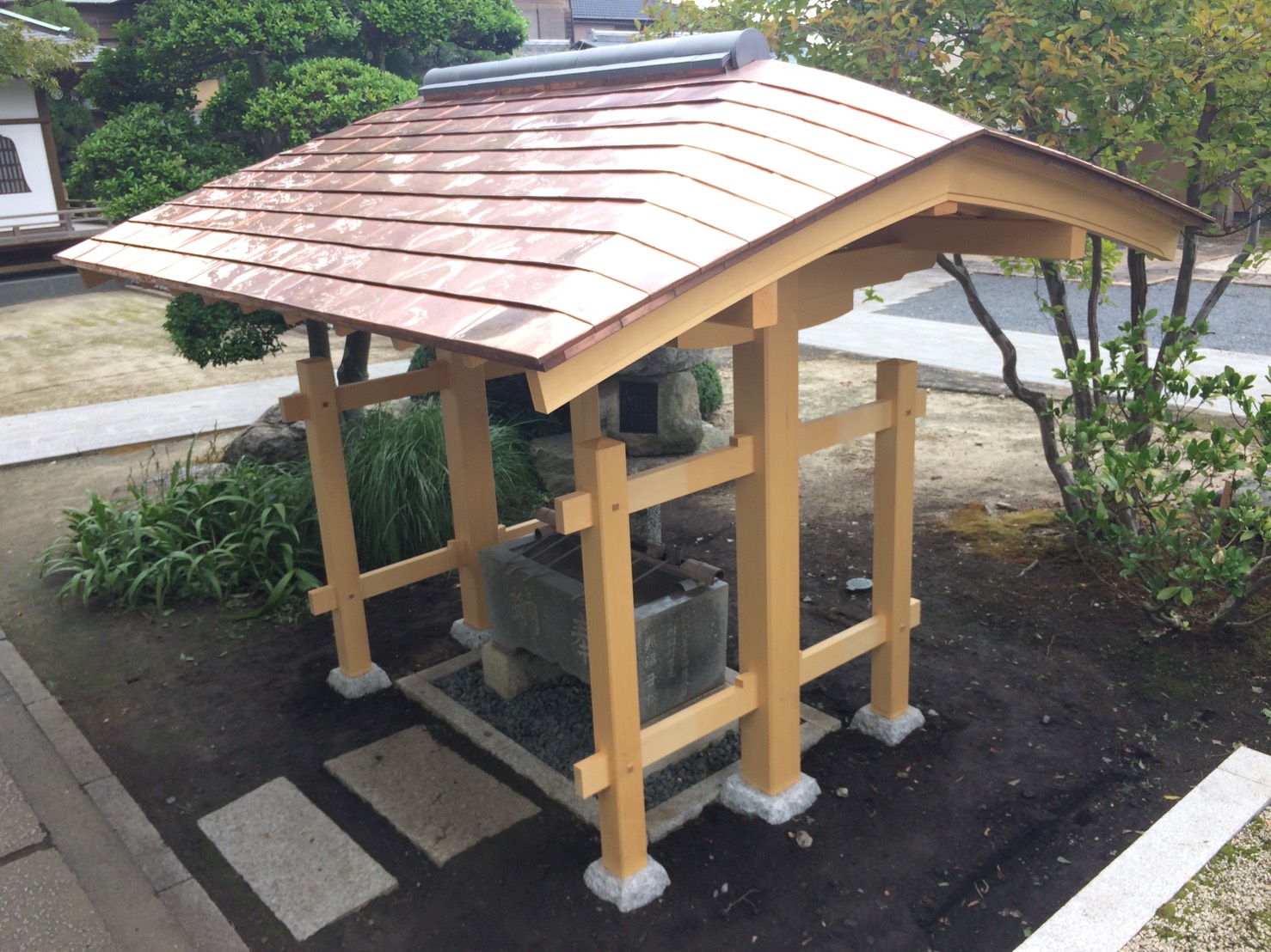 社寺建築といえば美しい反り屋根が一般的ですが、境内の雰囲気に合わせてさりげなく品のある数寄屋門のような手水舎を設計しました。 屋根勾配の流れのラインをすべて直線ではなく、やんわりとむくった曲線とすることで、昔の茅葺屋根のような柔らかい印象を銅板葺きで表現しております。銅板の色が落ち着けば、とてもやわらかい印象の手水舎になります。