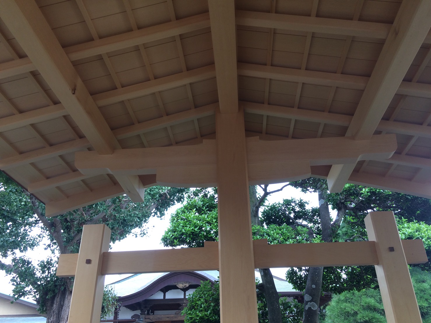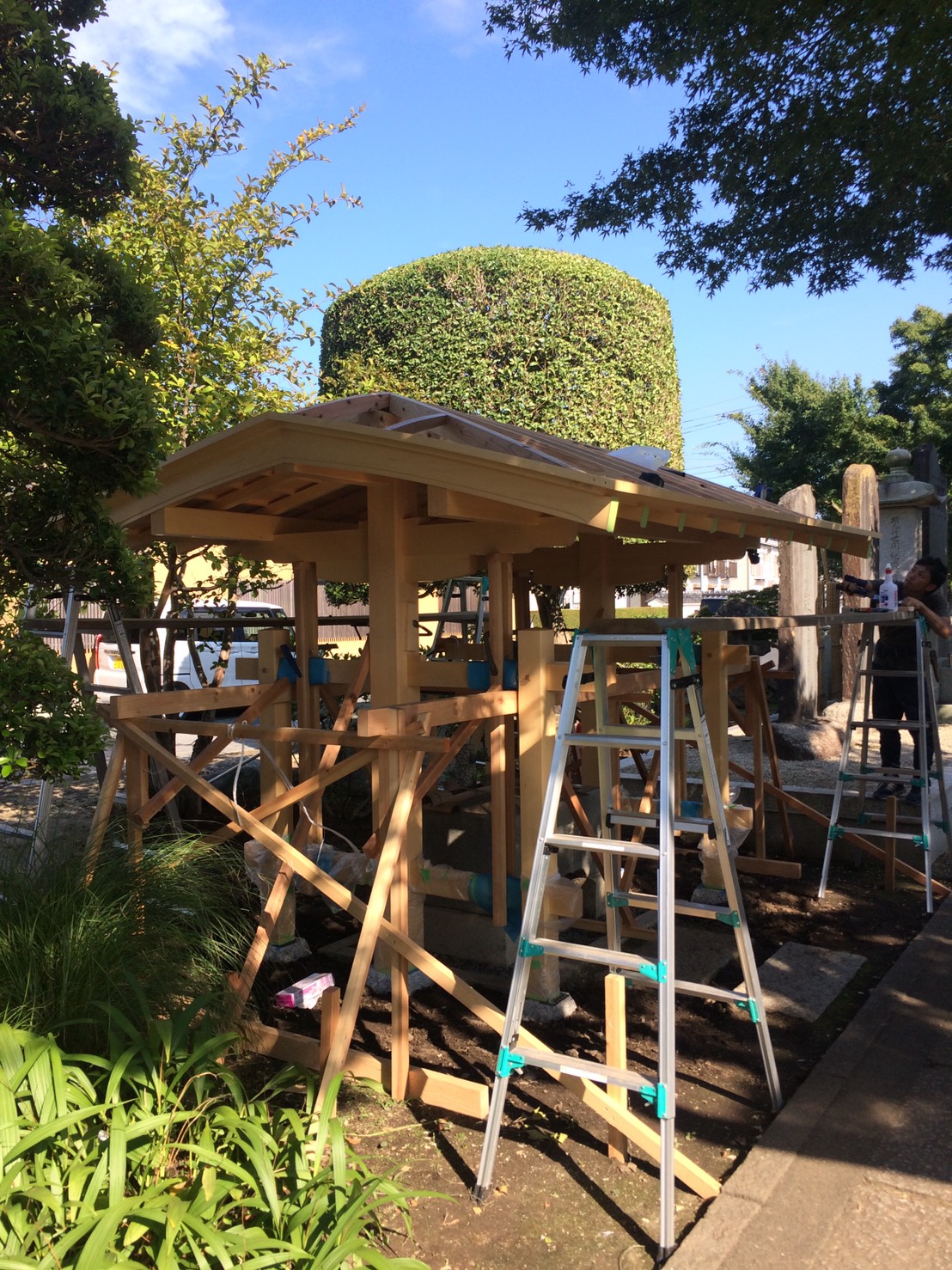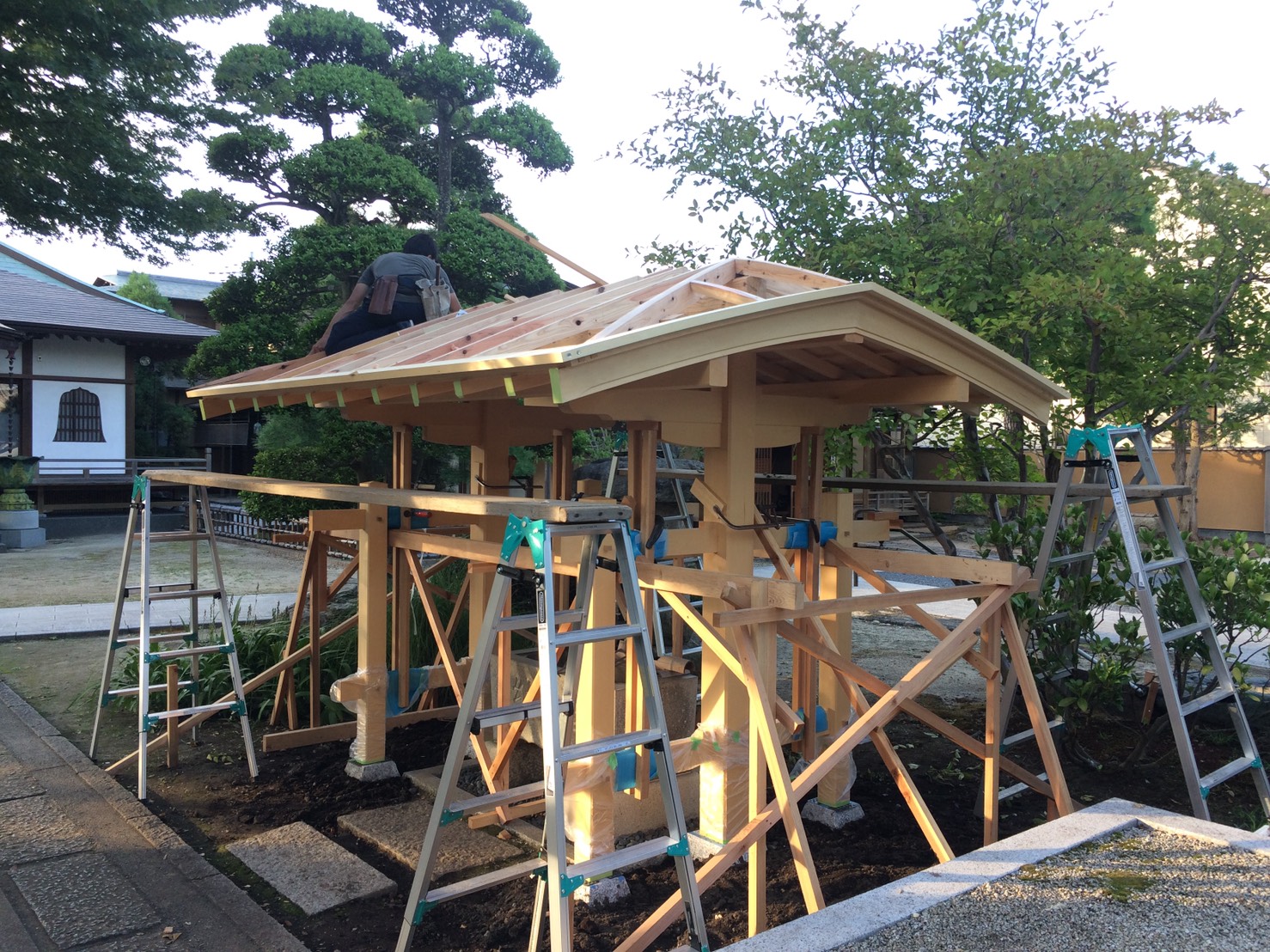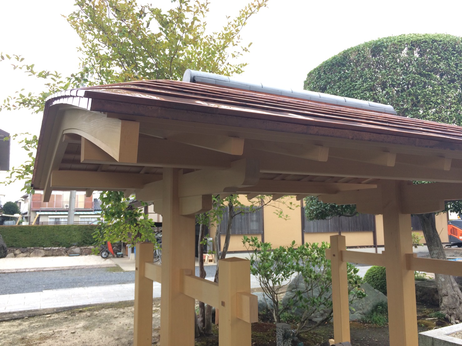 社寺建築といえば美しい反り屋根が一般的ですが、境内の雰囲気に合わせてさりげなく品のある数寄屋門のような手水舎を設計しました。 屋根勾配の流れのラインをすべて直線ではなく、やんわりとむくった曲線とすることで、昔の茅葺屋根のような柔らかい印象を銅板葺きで表現しております。銅板の色が落ち着けば、とてもやわらかい印象の手水舎になります。